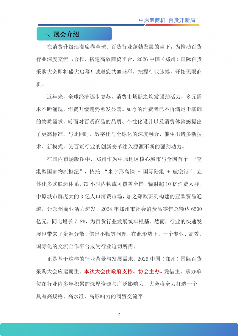在消費(fèi)升級浪潮席卷全球、百貨行業(yè)蓬勃發(fā)展的當(dāng)下,為推動(dòng)百貨行業(yè)深度交流與合作,搭建高效商貿(mào)平臺,2026中國(鄭州)國際百貨采購大會即將盛大啟幕!誠邀您共襄盛舉,把握行業(yè)脈搏,開拓?zé)o限商機(jī)。