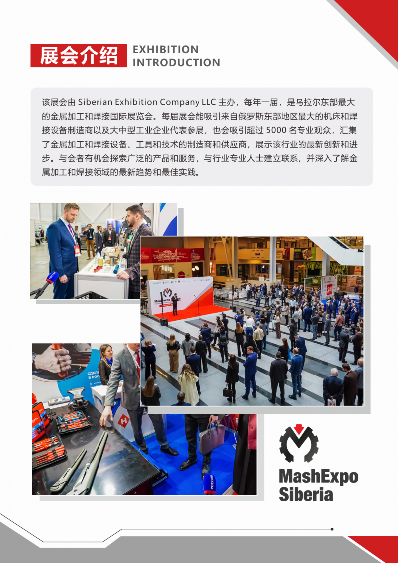 該展會由Siberian Exhibition Company LLC主辦,每年一屆,是烏拉爾東部最大的金屬加工和焊接國際展覽會。每屆展會能吸引來自俄羅斯東部地區最大的機床和焊接設備制造商以及大中型工業企業代表參展,也會吸引超過5000名專業觀眾,匯集了金屬加工和焊接設備、工具和技術的制造商和供應商,展示該行業的最新創新和進步。與會者有機會探索廣泛的產品和服務,與行業專業人士建立聯系,并深入了解金屬加工和焊接領域的最新趨勢和最佳實踐。